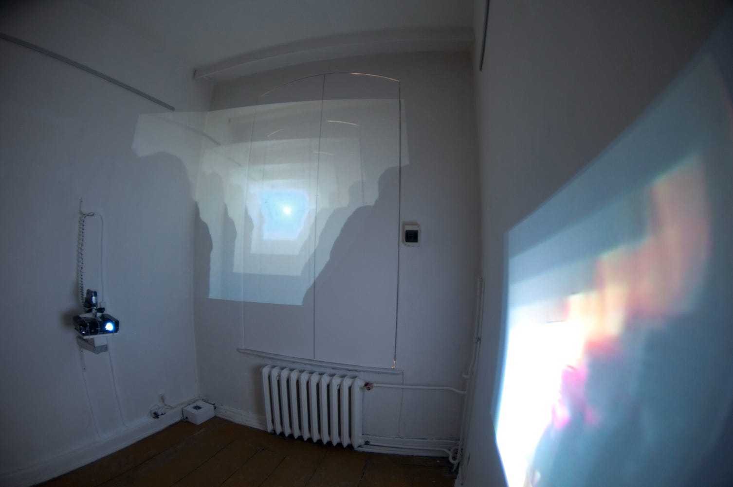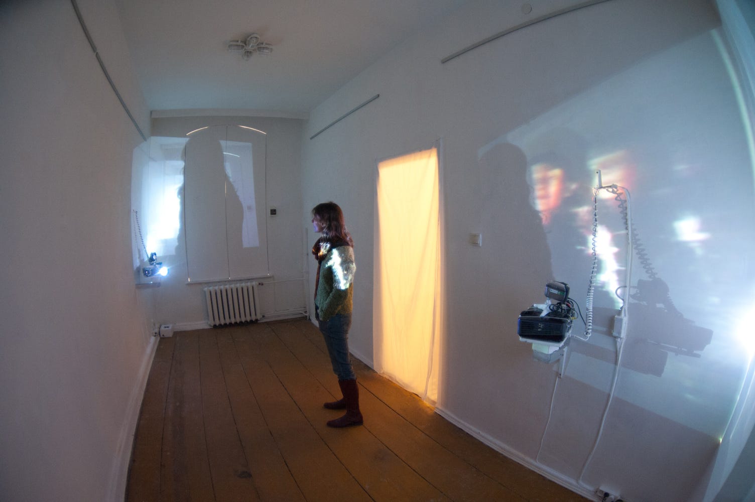 The second part of the exhibition is called “Transgressive Perception”. It originates in my deep fascination with vortex- like visual experiences. Passages, transitions in psychological and emotional space always appeared to me as transcendental situations leading to a new opening. Again, I have put this experience alongside a striking aspect of our modern world. The 21‘st century is a time of a constant flux of information. We have adjusted to being able to access almost any kind of information easily. Photographs taken in one part of the world can practically straight away be seen at the opposite side of the globe. The situation of being watched through surveillance cameras is a well known and accepted fact. The transmission of digital data serves all of us in many different ways, yet it goes on all around us, often unnoticed. We unwittingly take part in its gigantic wave every time we use our cell-phone or computer. I decided to visualize this process allowing the observer to become a part of it.