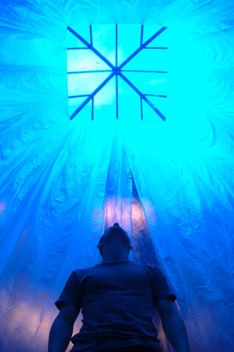 “Metaphor” 2003, Centre of Polish Sculpture Orońsko, Poland - Triennial of Young Artists. A light conduit made from delicate transfusive plastic. Inside, the only one unblocked sky light window was letting in light filtered through ultramarine filters. It’s very delicate physicality created a powerful presence, directing the light into the gallery. People were welcome inside to look at the passing clouds, birds crossing the visible share of the sky and changes of light, as the setting sun was leaving the metaphor.