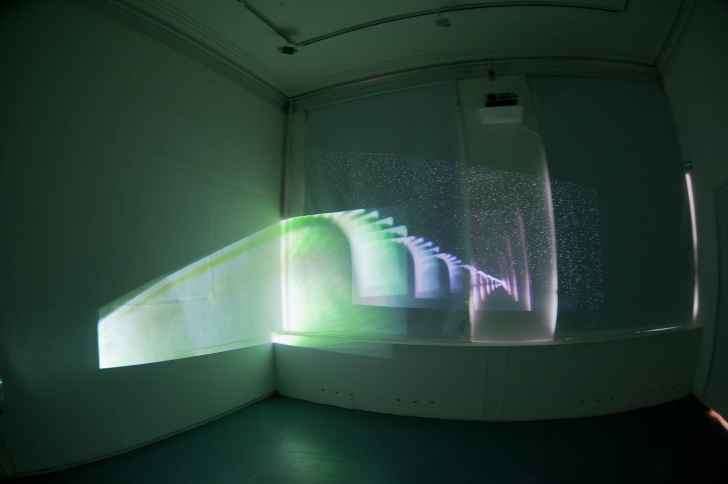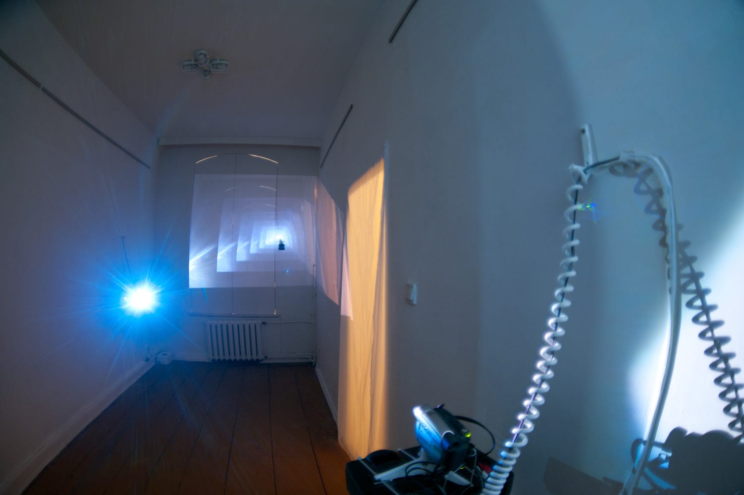 The second part of the exhibition is called “Transgressive Perception”. It originates in my deep fascination with vortex- like visual experiences. Passages, transitions in psychological and emotional space always appeared to me as transcendental situations leading to a new opening. Again, I have put this experience alongside a striking aspect of our modern world. The 21‘st century is a time of a constant flux of information. We have adjusted to being able to access almost any kind of information easily. Photographs taken in one part of the world can practically straight away be seen at the opposite side of the globe. The situation of being watched through surveillance cameras is a well known and accepted fact. The transmission of digital data serves all of us in many different ways, yet it goes on all around us, often unnoticed. We unwittingly take part in its gigantic wave every time we use our cell-phone or computer. I decided to visualize this process allowing the observer to become a part of it.